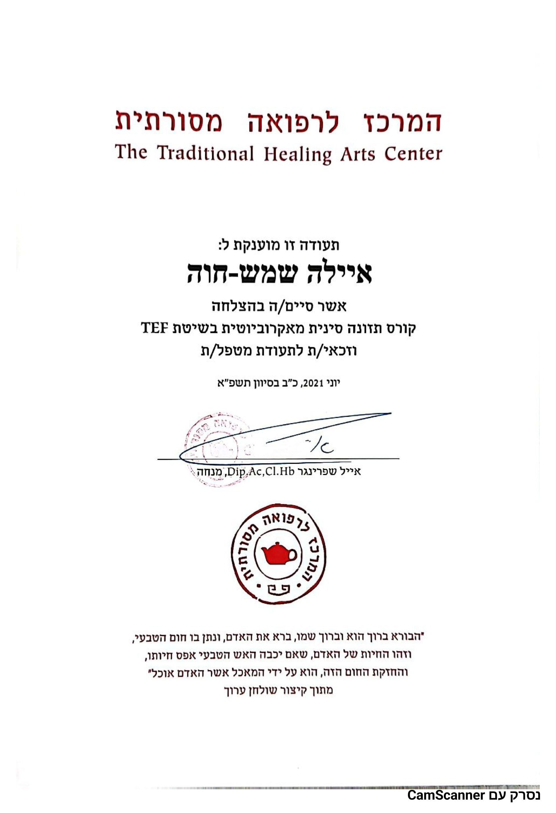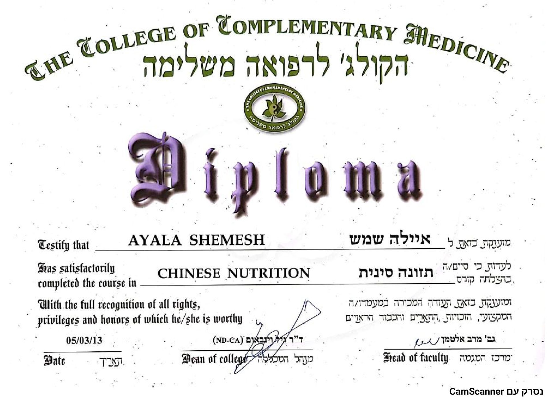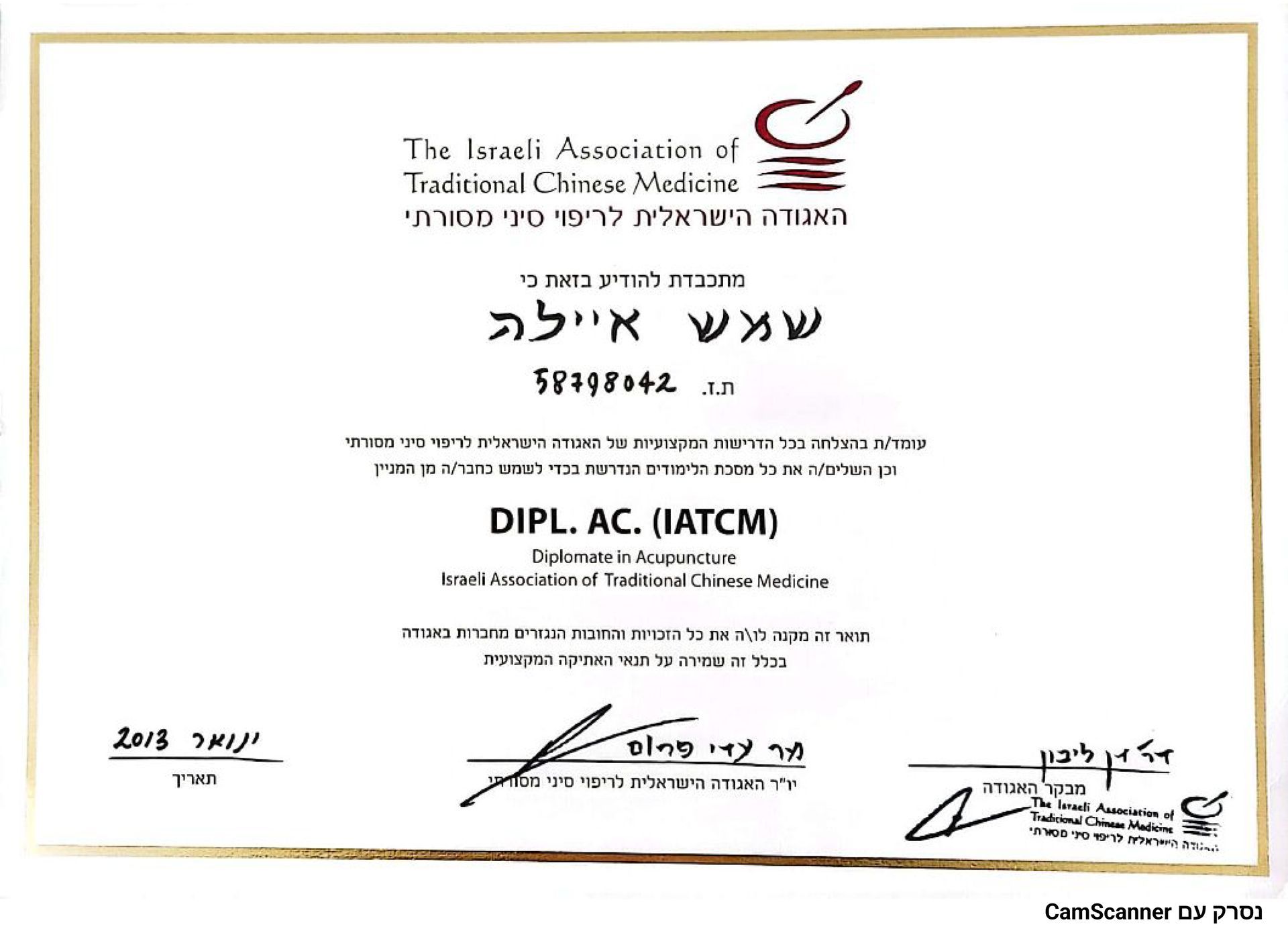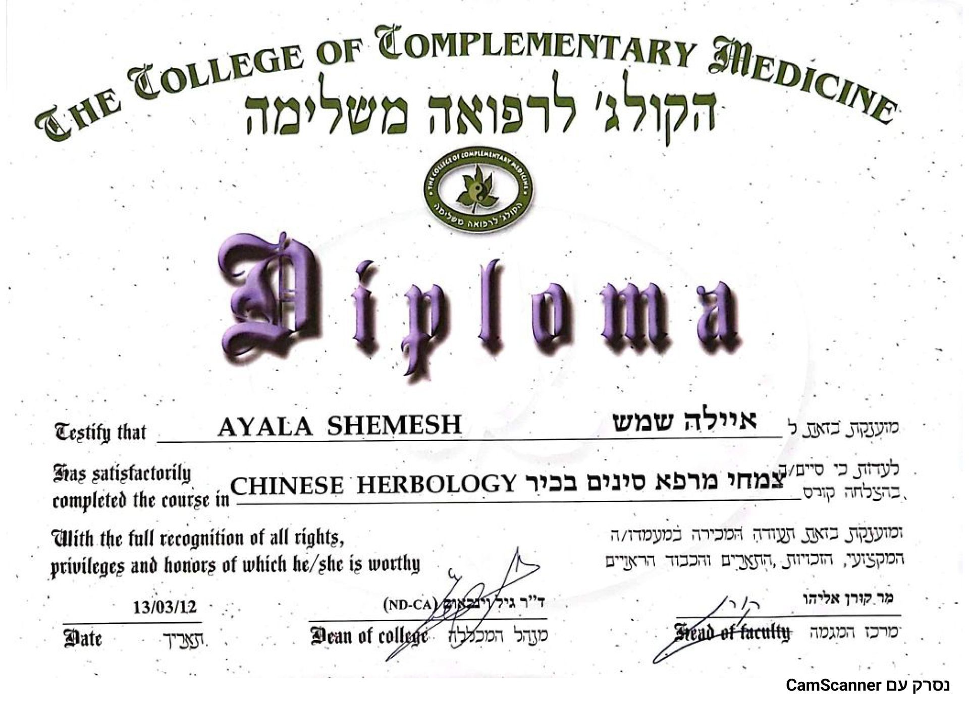 - מוסמכת כמטפלת ברפואה סינית מטעם הקולג' לרפואה משלימה והאיגוד לרפואה לרפואה סינית